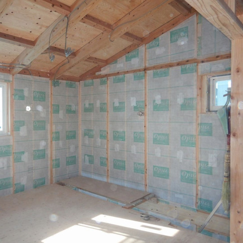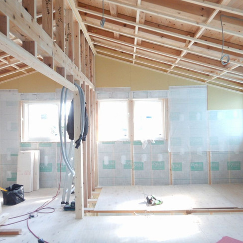 みっちりと断熱材を吹込するために、不織布を張り詰め、壁内にセルロースファイバーを詰めていきます。